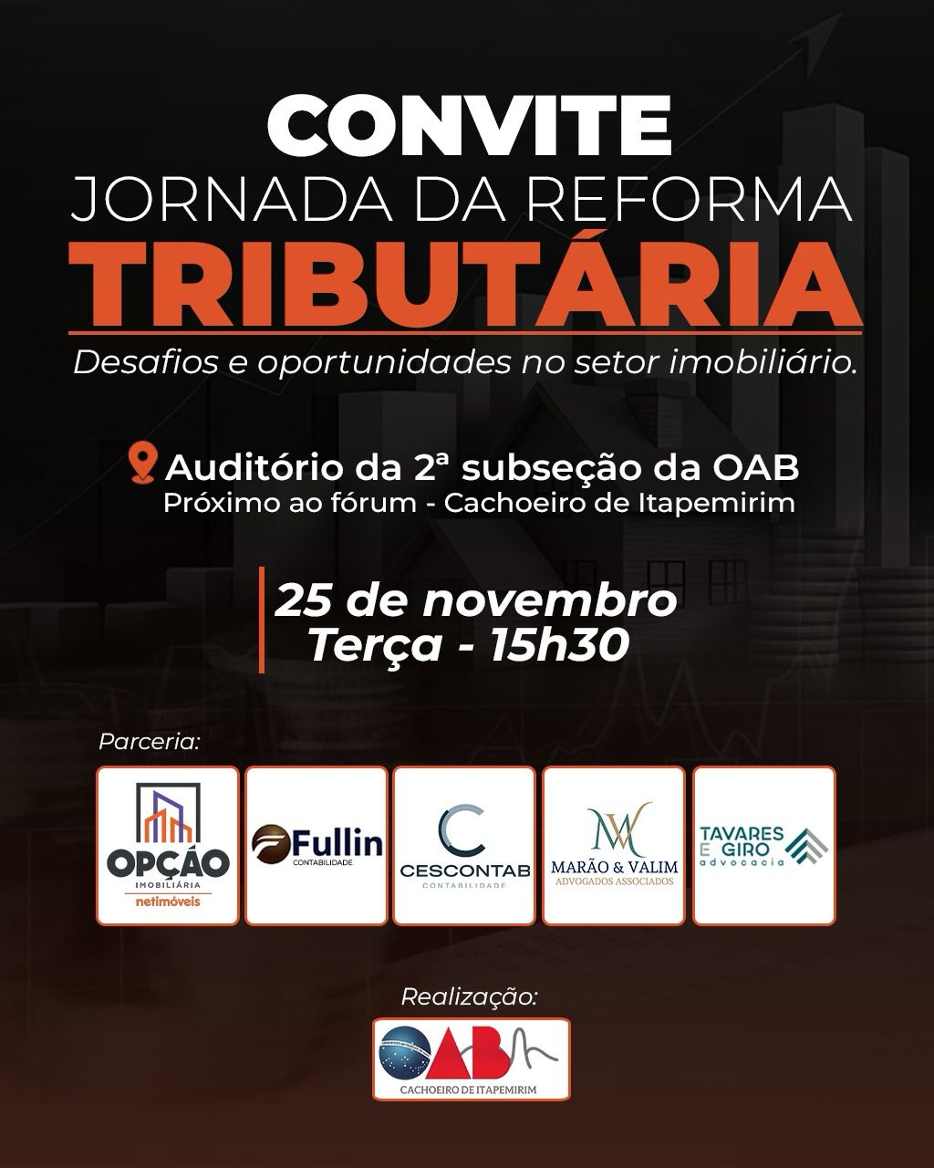 A Jornada da Reforma Tributária acontecerá no dia 25 de novembro, terça-feira, às 15h30, no auditório da 2ª Subseção da OAB-ES, em Cachoeiro de Itapemirim. O evento presencial enfocará especificamente os desafios e oportunidades para o setor imobiliário diante das mudanças legislativas que entrarão em vigor gradualmente a partir de 2026. Segundo os organizadores, o setor imobiliário está entre os mais impactados pelas alterações da reforma tributária, tornando-se essencial a compreensão antecipada das novas regras.
