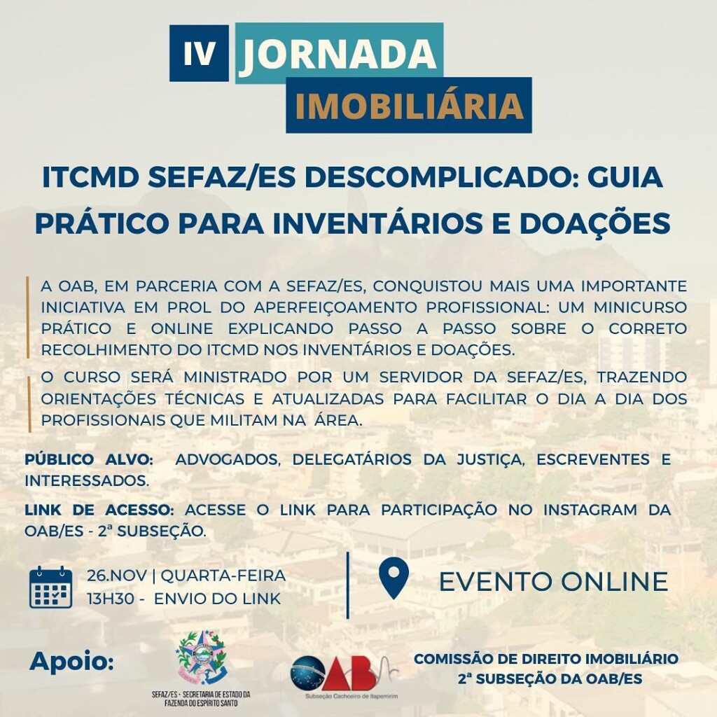 No dia seguinte, quarta-feira (26), às 13h30, a Comissão de Direito Imobiliário, Condominial, Notarial e Registral da 2ª Subseção da OAB-ES realizará a IV Jornada Imobiliária, um minicurso online e prático sobre o correto recolhimento do ITCMD em inventários e doações. O evento será ministrado por servidor da Secretaria de Estado da Fazenda do Espírito Santo, em parceria institucional da Ordem com a SEFAZ-ES, trazendo orientações técnicas e atualizadas sobre a utilização do sistema de declaração e recolhimento do imposto. O público-alvo inclui advogados, delegatários da Justiça, escreventes e demais interessados, com inscrições disponíveis no Instagram da 2ª Subseção.