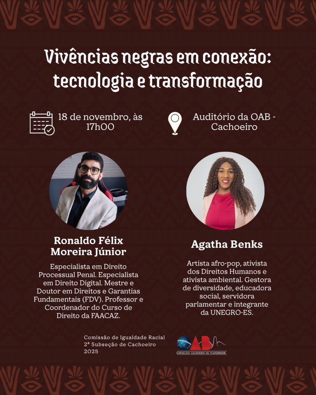A Comissão de Igualdade Racial da 2ª Subseção da OAB-ES promove, nesta terça-feira (18), às 17h, o evento “Vivências Negras em Conexão: Tecnologia e Transformação” no auditório do Edifício OAB, em Cachoeiro de Itapemirim. A iniciativa, realizada em alusão ao Dia Nacional de Zumbi e da Consciência Negra, celebrado em 20 de novembro, busca ampliar o diálogo sobre desigualdades estruturais e fortalecer a luta por equidade e representatividade na advocacia regional.