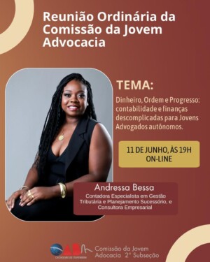 Já no próximo dia 11, a Comissão da Jovem Advocacia da 2ª Subseção da OAB-ES realiza sua reunião ordinária às 19h. Durante o encontro, que será virtual, os advogados e advogadas interessados em participar terão a oportunidade de acompanhar uma palestra sobre a temática “Dinheiro, Ordem e Progresso: contabilidade e finanças descomplicadas para jovens advogados autônomos”.