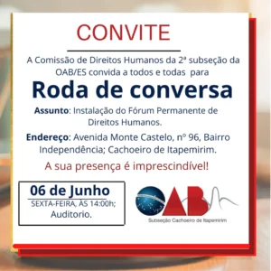 A primeira quinzena de junho será marcada por pelo menos dois importantes eventos organizados pelas comissões temáticas da 2ª Subseção da OAB-ES. O primeiro, presencial, acontecerá na próxima sexta-feira (06), às 14h, no auditório do Edifício OAB, no bairro Independência, em Cachoeiro de Itapemirim. Trata-se de uma “roda de conversa” organizada pela Comissão de Direitos Humanos com o objetivo de discutir a instalação do Fórum Permanente de Direitos Humanos.