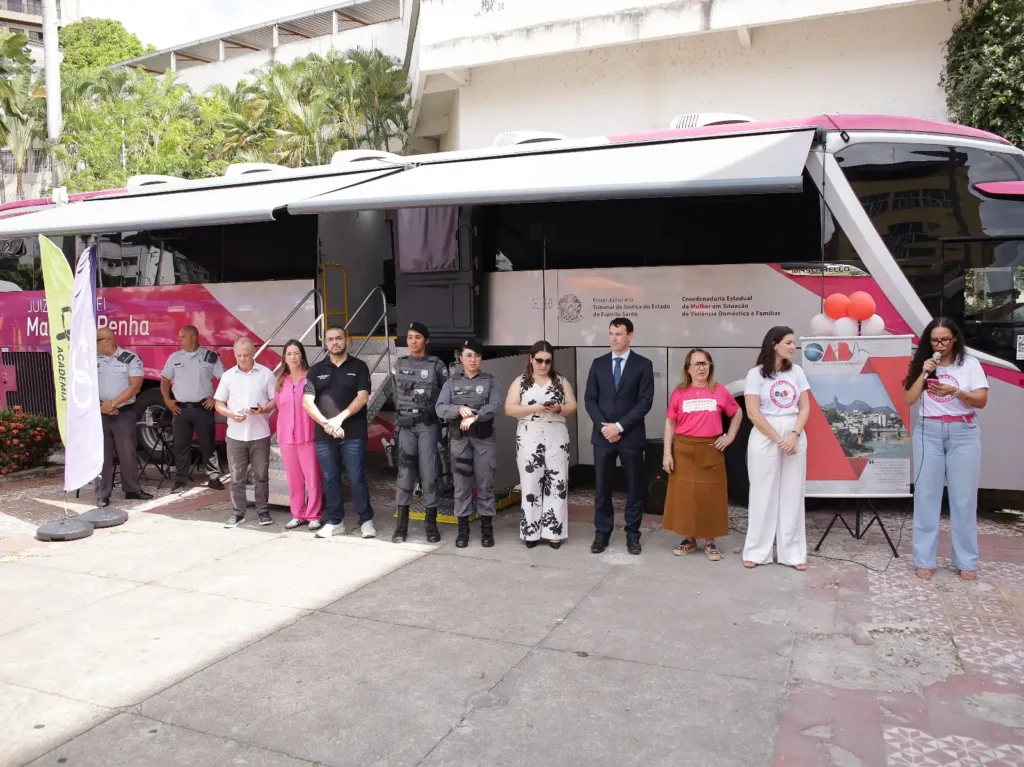 O Ônibus Rosa opera desde 2013 como unidade móvel especializada do TJES. O veículo abriga cinco compartimentos funcionais: sala para atendimento da equipe multidisciplinar com psicólogos e assistentes sociais, salas destinadas ao Ministério Público e Defensoria Pública, sala de audiências e cartório do juizado. Esta estrutura completa permite que o sistema de justiça ofereça resposta integral às vítimas, desde o acolhimento psicológico até a tramitação de medidas protetivas de urgência.