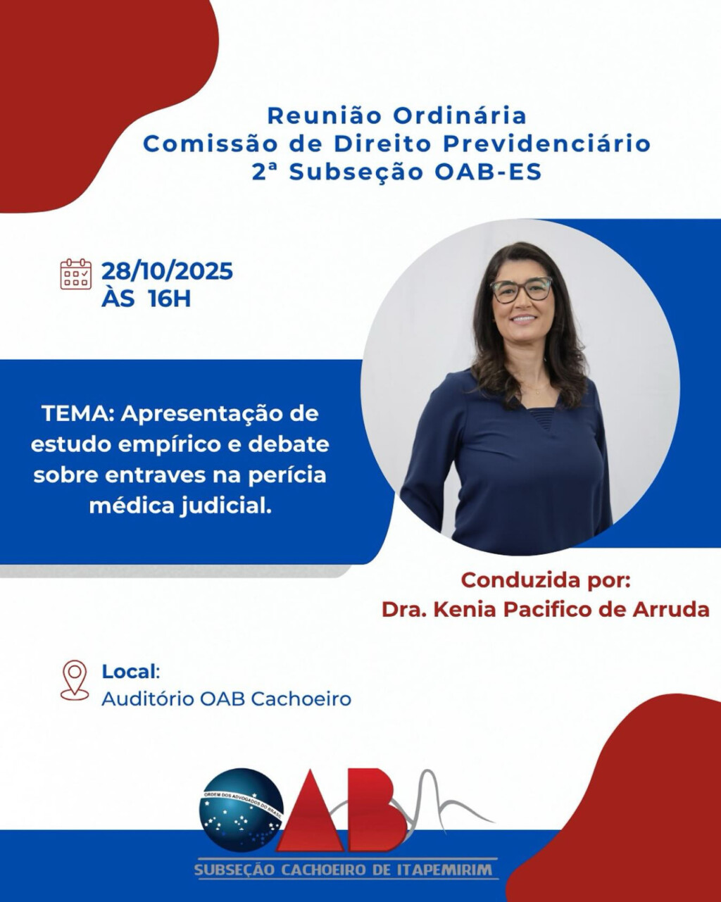 A Comissão de Direito Previdenciário da 2ª Subseção da OAB-ES realizará, na próxima terça-feira (28) sua reunião ordinária com foco em um tema que tem mobilizado crescente atenção no meio jurídico brasileiro: os entraves na perícia médica judicial no âmbito previdenciário. O encontro, marcado para as 16h no auditório do Edifício OAB, no bairro Independência, em Cachoeiro de Itapemirim, contará com a apresentação de um estudo empírico pela advogada Kenia Pacifico de Arruda, presidente da comissão. A palestra promete trazer à luz dados sobre as dificuldades atuais do sistema pericial e suas repercussões práticas para a advocacia previdenciária regional.
